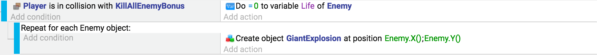 In the example below, the goal is to create an explosion at the position of every enemy. When the player is in a collision with an object called "KillAllEnemyBonus", a "For Each" event is used to create a new object located at the position of each enemy. If a "For Each" event is not used, a single explosion would be created at the position of the first enemy only.