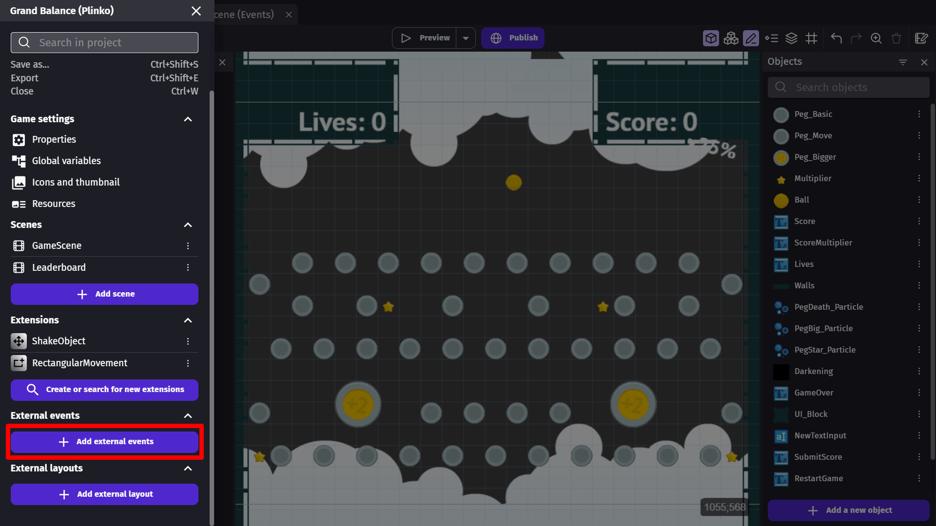 External Events, like normal events, define the logic of the game. They are edited in the exact same way as they are in the event editor. Unlike a normal event sheet though, external events can be reused throughout your game through links.
