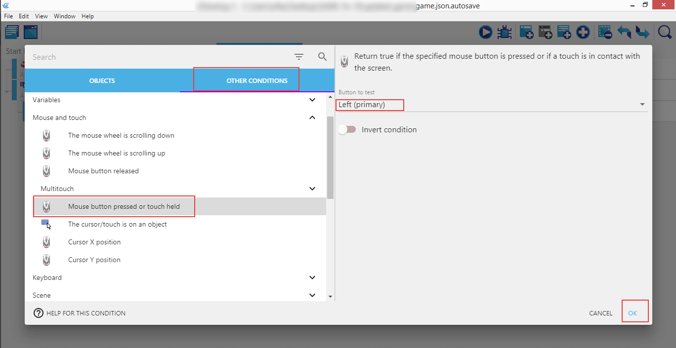 "Other conditions", "Mouse button pressed or touch held", "Left (primary)".